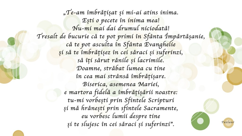 Doamne, străbat lumea cu tine în cea mai strânsă îmbrățișare. Biserica, asemenea Mariei, e martora fidelă a îmbrățișării noastre: tu-mi vorbești prin Sfintele Scripturi și mă hrănești prin sfintele Sacramente, eu vorbesc lumii despre tine și te slujesc în cei săraci și suferinzi”.