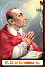 Astăzi Biserica îl comemorează pe sfântul Carol Borromeu, episcop. La începutul sfintei Liturghii am înălţat această rugăciune: „Te rugăm, Doamne, păstrează în poporul tău spiritul care l-a însufleţit pe sfântul episcop Carol Borromeu, pentru ca Biserica să se reînnoiască necontenit şi, urmând tot mai îndeaproape evanghelia, să poată arăta lumii adevăratul chip al lui Cristos”. Cu adevărat Biserica s-a reînnoit prin munca şi viaţa acestui episcop de Milano. Un păstor bun este un dar excelent pentru Biserică, aşa cum a fost Carol pentru Biserica din Milano şi pentru întreaga Biserică. Consacrat episcop la numai 25 de ani, acest tânăr s-a dăruit total slujirii poporului său, oferindu-şi bunurile şi sănătatea, angajându-se în munci obositoare şi penitenţe extreme, care, desigur, i-au scurtat şi viaţa (2 octombrie 1538 – 3 noiembrie 1584). A promovat cu energie şi răbdare aplicarea Conciliului din Trento, cu o constantă preocupare pentru formarea preoţilor sfinţi şi plini de zel.