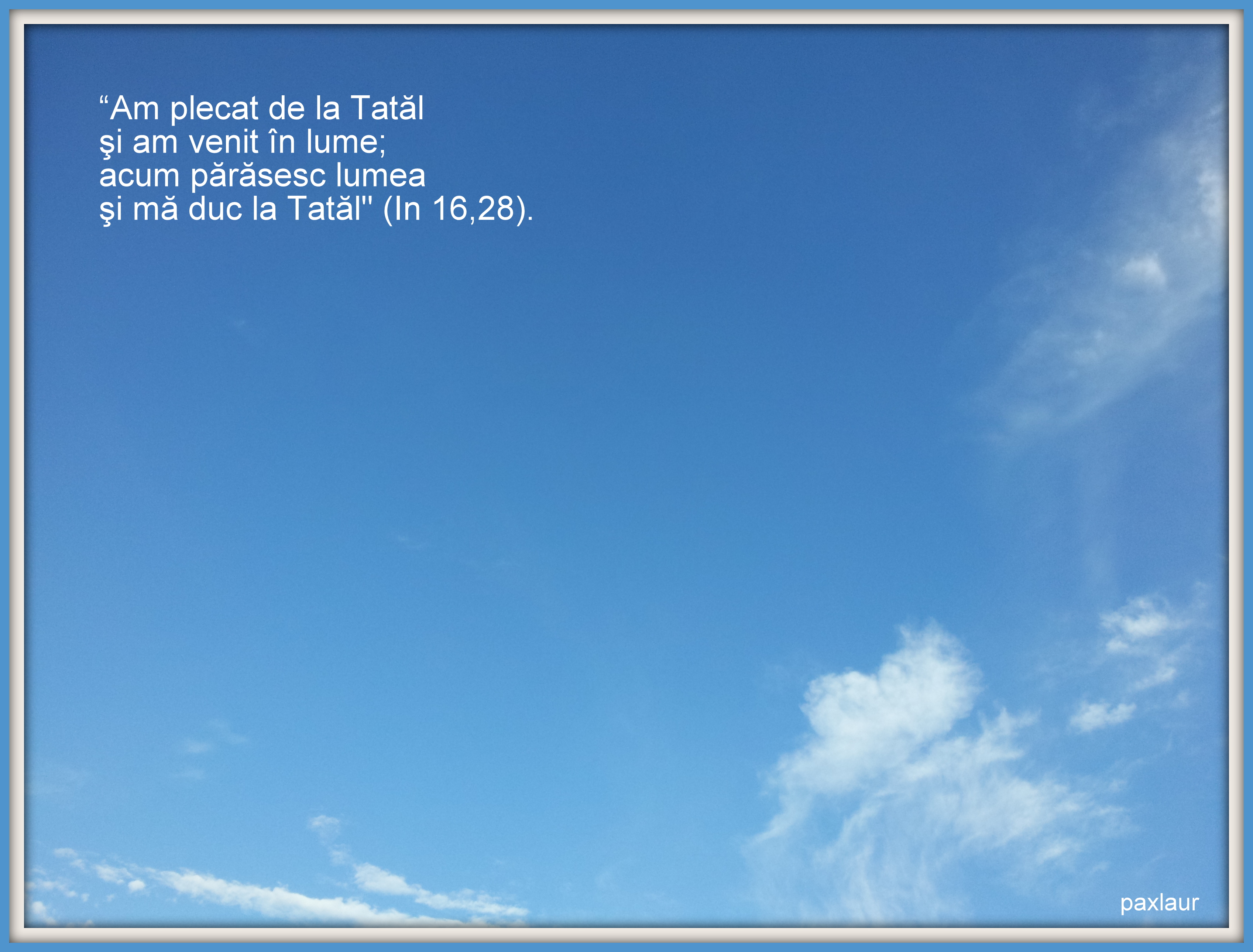 Când am citit evanghelia zilei şi am ajuns la versetul: „Am plecat de la Tatăl şi am venit în lume; acum părăsesc lumea şi mă duc la Tatăl” (In 16,28) am simţit parcă o satisfacţie în cuvântul lui Isus: „mă întorc la Tatăl”. E ca şi cum abia aştepta, ca şi cum s-ar fi săturat de lumea asta. Şi mă întreb: oare în cei 33 de ani pe care i-a petrecut aici pe pământ a regretat Domnul vreodată că „a plecat de la Tatăl şi a venit în lume”?!