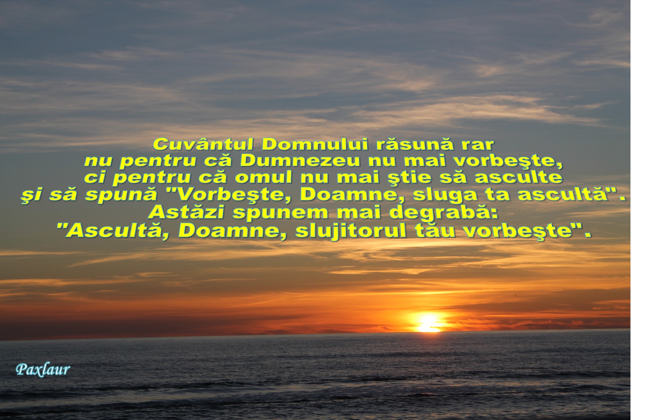Astăzi nu mai ştim sau nu mai avem răbdare să ascultăm acest cuvânt al lui Dumnezeu, cuvânt care răsună din ce în ce mai rar. Şi răsună rar nu pentru că Dumnezeu nu mai vorbeşte, ci pentru că omul nu mai ştie să asculte şi să spună „Vorbeşte, Doamne, sluga ta ascultă”. Astăzi spunem mai degrabă: „Ascultă, Doamne, slujitorul tău vorbeşte!”. Cuvântul lui Dumnezeu se face auzit rar pentru că lipsesc oameni şi preoţi ca Eli care să-şi dea seama că Domnul vorbeşte, cheamă, şi să-i ajute şi pe ceilalţi să-i recunoască vocea. Cuvântul Domnului se aude rar pentru că lipsesc oameni care să se trezească dis de dimineaţă şi să alerge cu bucurie spre rugăciune, „spaţiul” în care glasul lui Dumnezeu inundă inima omului şi strigătul omului îl face pe cel atotputernic să asculte şi să binecuvânteze.