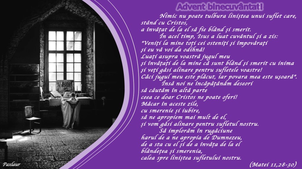 În acel timp, Isus a luat cuvântul şi a zis: „Veniţi la mine toţi cei osteniţi şi împovăraţi şi eu vă voi da odihnă! 29 Luaţi asupra voastră jugul meu şi învăţaţi de la mine că sunt blând şi smerit cu inima şi veţi găsi alinare pentru sufletele voastre! 30 Căci jugul meu este plăcut, iar povara mea este uşoară”.