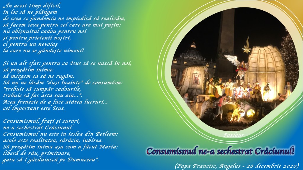 Şi noi, ce „da” putem spune? În acest timp dificil, în loc să ne plângem de ceea ce pandemia ne împiedică să realizăm, să facem ceva pentru cel care are mai puţin: nu obişnuitul cadou pentru noi şi pentru prietenii noştri, ci pentru un nevoiaş la care nu se gândeşte nimeni! Şi un alt sfat: pentru ca Isus să se nască în noi, să pregătim inima: să mergem ca să ne rugăm. Să nu ne lăsăm „duşi înainte” de consumism: „trebuie să cumpăr cadourile, trebuie să fac asta sau aia…”. Acea frenezie de a face atâtea lucruri… cel important este Isus. Consumismul, fraţi şi surori, ne-a sechestrat Crăciunul. Consumismul nu este în ieslea din Betleem: acolo este realitatea, sărăcia, iubirea. Să pregătim inima aşa cum a făcut Maria: liberă de rău, primitoare, gata să-l găzduiască pe Dumnezeu.