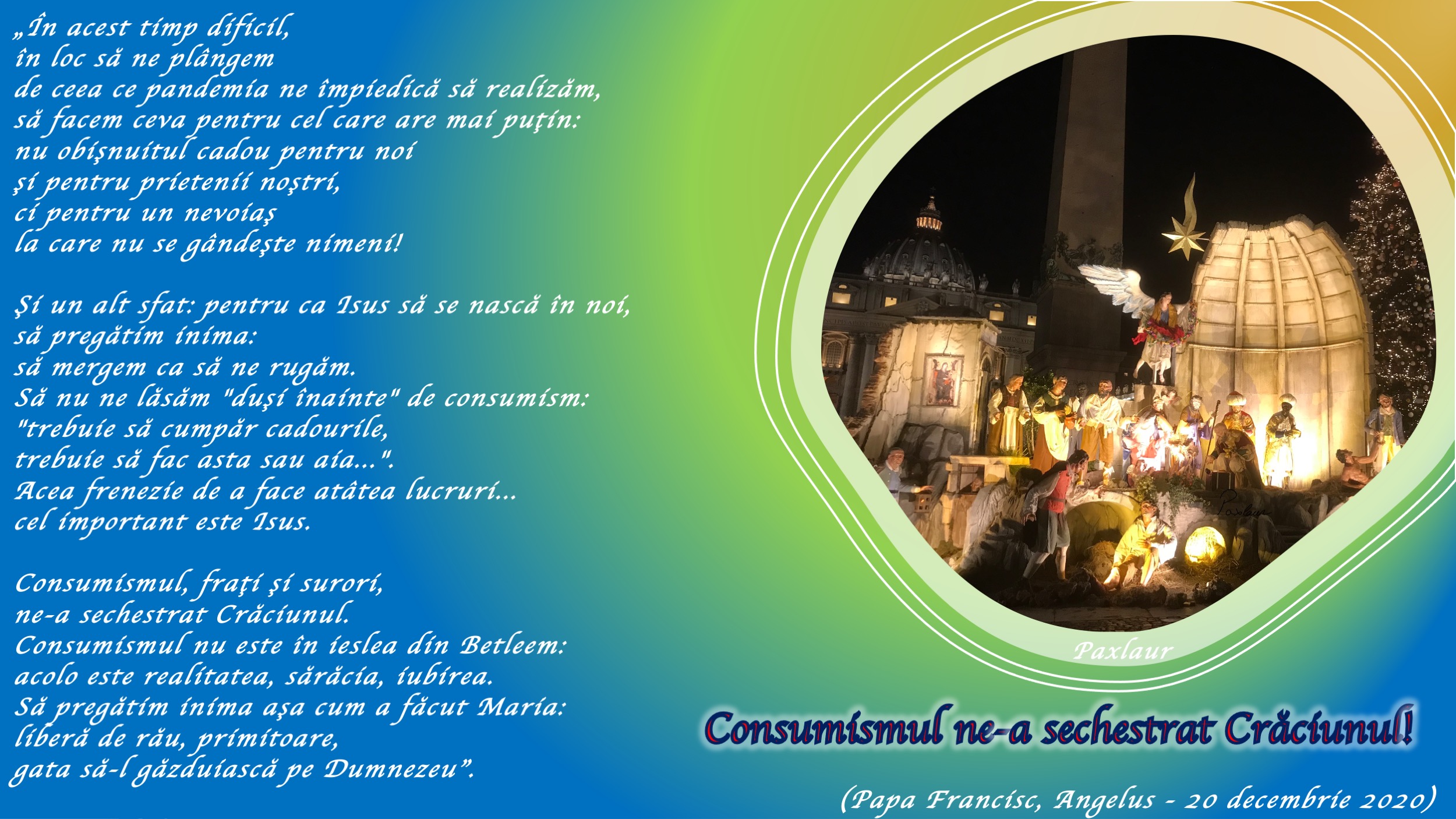 Anul acesta organizatorii au avut ideea fericită de a face expoziţia „100 de iesle” sub Coloane. Sunt multe iesle care desfăşoară tocmai o cateheză a credinţei pentru poporul lui Dumnezeu. Vă invit să vizitaţi ieslele sub Coloane, pentru a înţelege cum încearcă oamenii să arată cu arta cum s-a născut Isus. Ieslele care sunt sub Coloane sunt o mare cateheză a credinţei noastre.