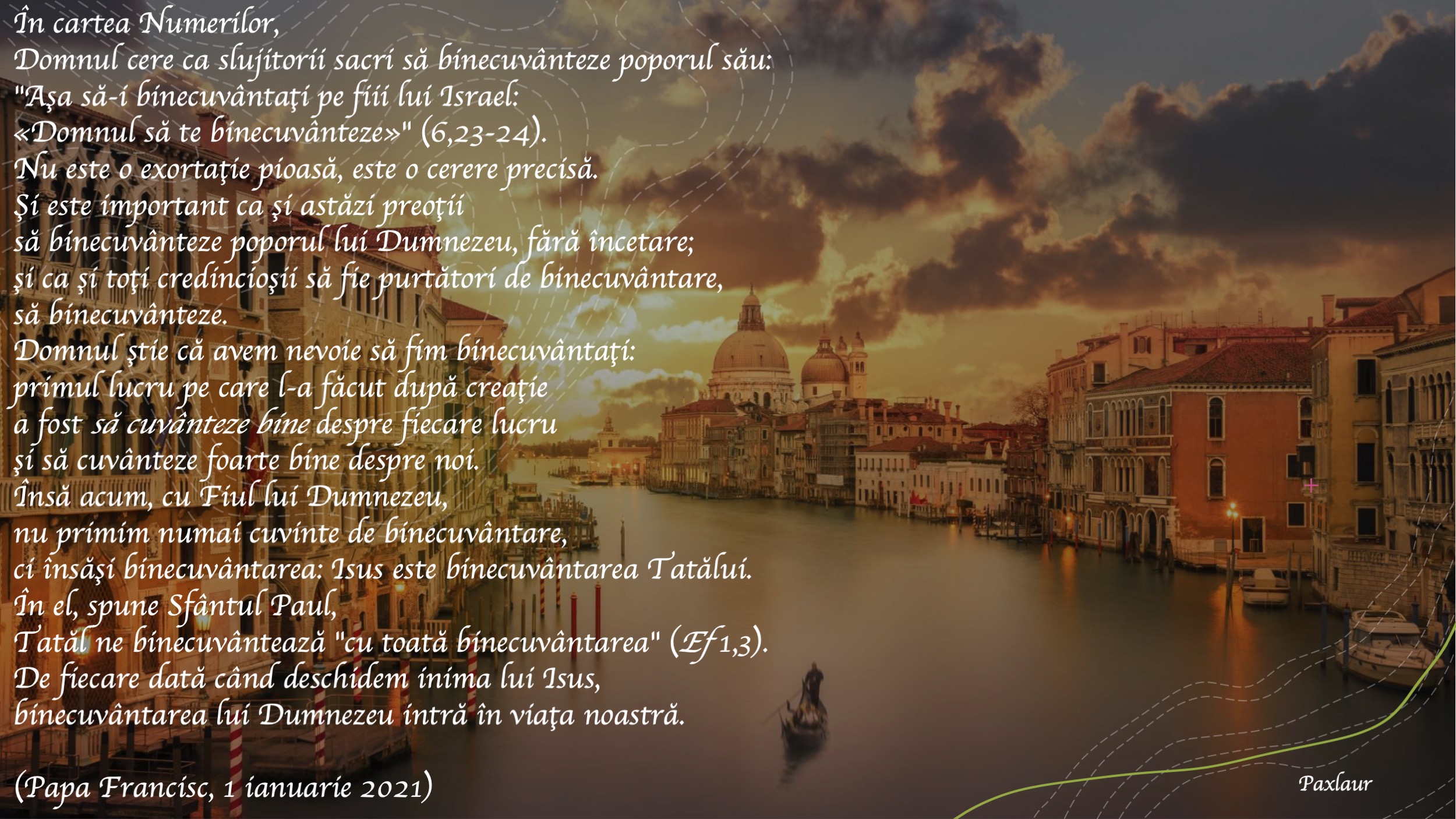 A binecuvânta. În cartea Numerilor, Domnul cere ca slujitorii sacri să binecuvânteze poporul său: „Aşa să-i binecuvântaţi pe fiii lui Israel: «Domnul să te binecuvânteze»” (6,23-24). Nu este o exortaţie pioasă, este o cerere precisă. Şi este important ca şi astăzi preoţii să binecuvânteze poporul lui Dumnezeu, fără încetare; şi ca şi toţi credincioşii să fie purtători de binecuvântare, să binecuvânteze. Domnul ştie că avem nevoie să fim binecuvântaţi: primul lucru pe care l-a făcut după creaţie a fost să cuvânteze bine despre fiecare lucru şi să cuvânteze foarte bine despre noi. Însă acum, cu Fiul lui Dumnezeu, nu primim numai cuvinte de binecuvântare, ci însăşi binecuvântarea: Isus este binecuvântarea Tatălui. În el, spune Sfântul Paul, Tatăl ne binecuvântează „cu toată binecuvântarea” (Ef 1,3). De fiecare dată când deschidem inima lui Isus, binecuvântarea lui Dumnezeu intră în viaţa noastră.