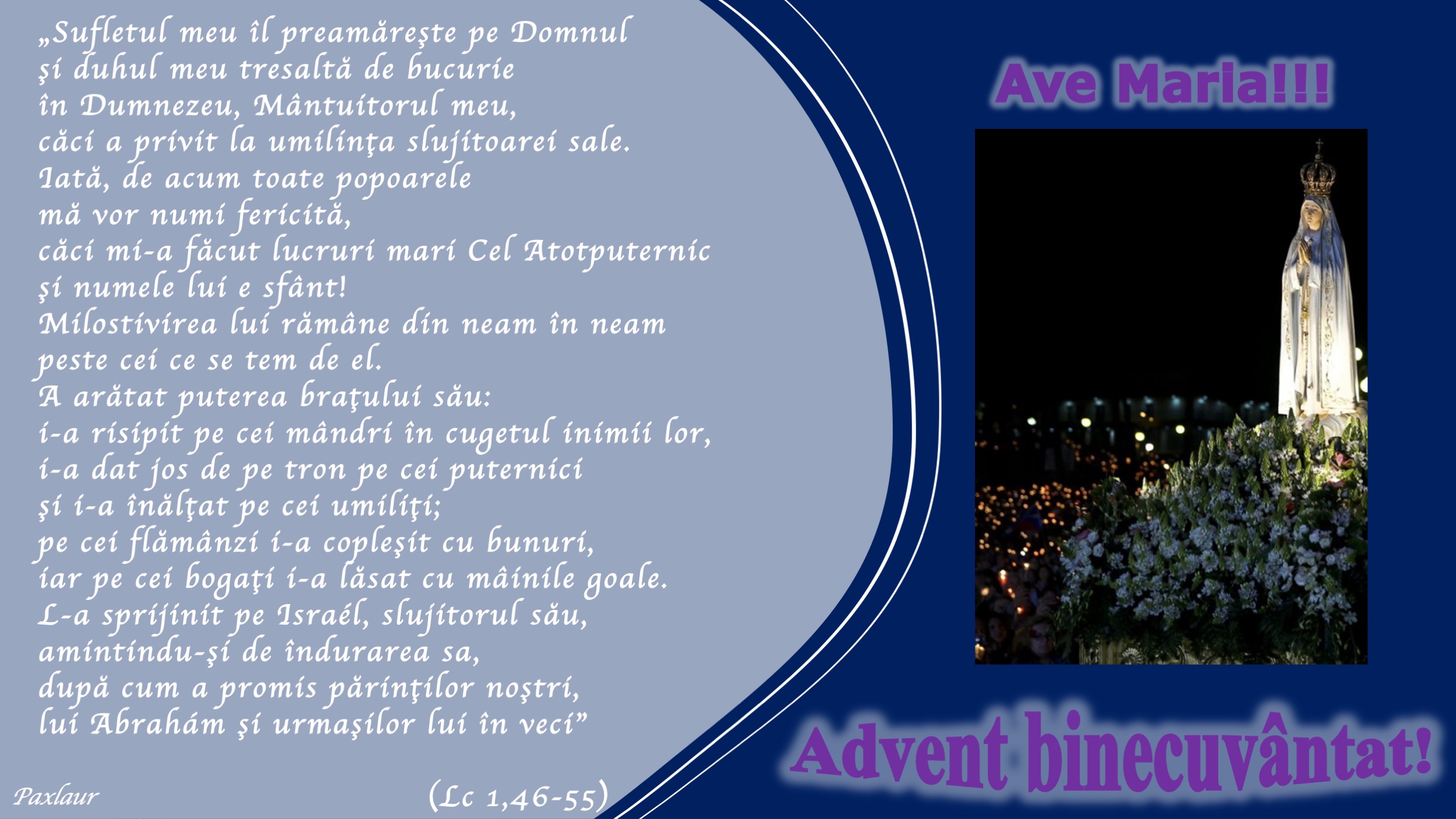 Bucură-te, Marie, cea plină de har, Domnul este cu tine, binecuvântată ești tu între femei, și binecuvântat este rodul trupului tău Isus, al cărui Duh Sfânt conduce Biserica.